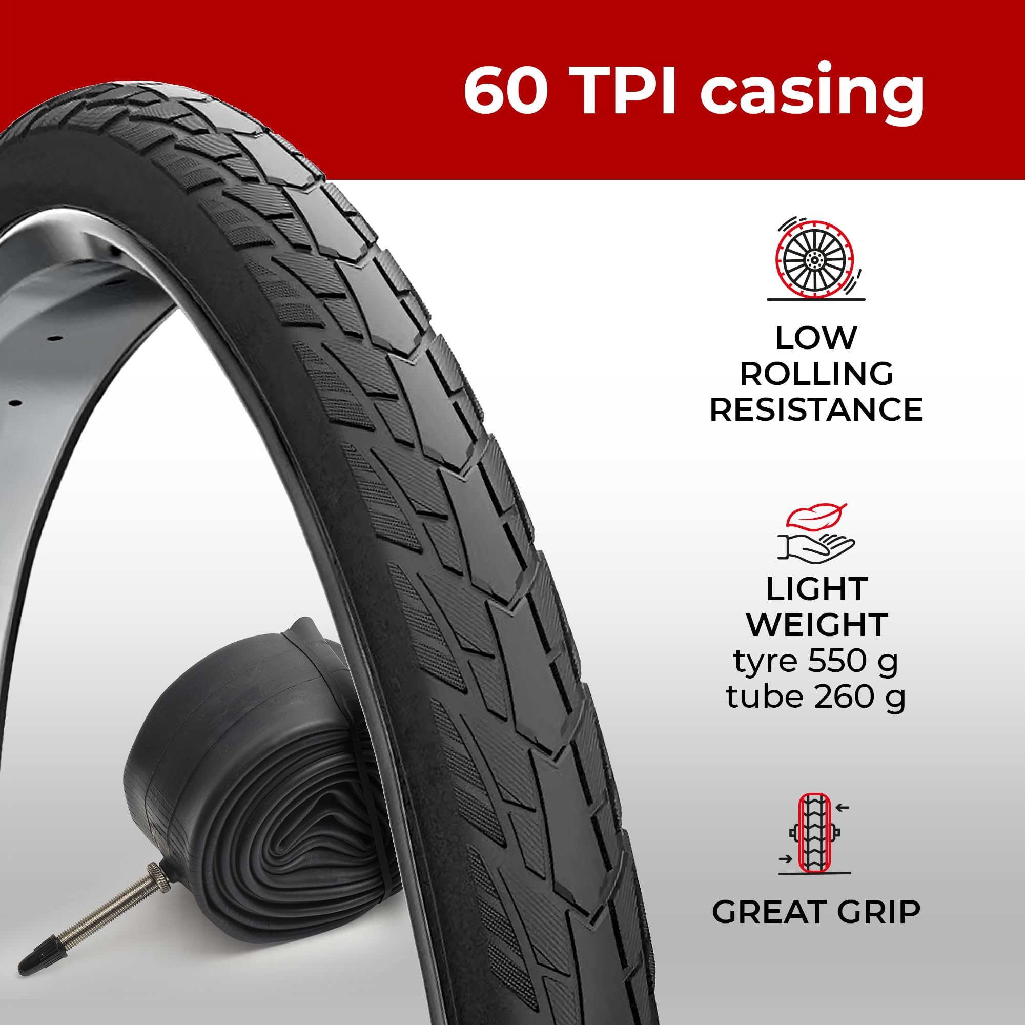 • High-Performance Tread – Tires designed with fast-rolling tread for efficient speed and dependable traction on tarmac, pavement, and uneven surfaces.